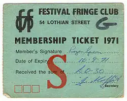 Formal organisation progressed in 1959, with the formation of the Festival Fringe Society. The push for such an organisation was led by Michael Imison, director of Oxford Theatre Group.[25] A constitution was drawn up, in which the policy of not vetting or censoring shows was set out, and the Society produced the first guide to Fringe shows. Nineteen companies participated in the Fringe in that year. By that time it provided a "complete... counter-festival programme"[26] although efforts were still being made to gain publicity through the International Festival programme.[27] The YMCA became established as the first central Fringe ticket office.[28]