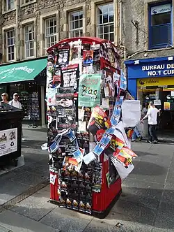 For many years, the Fringe Club (variously in the High Street from 1971 and at Teviot Row House from 1981) provided nightly showcases of Fringe fare to allow audiences to sample shows. In its earlier years the club also provided a significant space for after-hours socialising at a time when Edinburgh's strict licensing laws meant a 10pm pub closing time. For a time, the main ticket office was in the University Chaplaincy Centre, and then in the Royal Mile Centre on the High Street.[28] Although the Fringe was now associated with the High Street, areas like the New Town, West End and Morningside were also prominent in this period.[32]