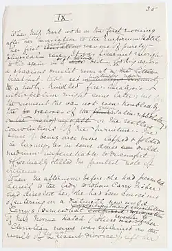 Wharton wrote and told stories from an early age.[14] When her family moved to Europe and she was just four or five, she started what she called "making up."[14] She invented stories for her family and walked with an open book, turning the pages as if reading while improvising a story.[14] Wharton began writing poetry and fiction as a young girl, and she attempted to write her first novel at the age of 11.[15] Her mother's criticism quashed her ambition, however, and she turned to poetry.[15] She was 15 years old when her first published work appeared, a translation of a German poem "Was die Steine Erzählen" ("What the Stones Tell") by Heinrich Karl Brugsch, for which she was paid $50. Her family did not want her name to appear in print, since writing was not considered a proper occupation for a society woman of her time. Consequently, the poem was published under the name of a friend's father, E. A. Washburn, a cousin of Ralph Waldo Emerson, who supported women's education.[16] In 1877, at the age of 15, she secretly wrote a novella, Fast and Loose. In 1878, her father arranged for a collection of two dozen original poems and five translations, Verses, to be privately published.[17] Wharton published a poem under a pseudonym in the New York World, in 1879.[18] In 1880, she had five poems published anonymously in the Atlantic Monthly, an important literary magazine.[19] Despite these early successes, she was not encouraged by her family or her social circle, and though she continued to write, she did not publish anything more until her poem "The Last Giustiniani" was published in Scribner's Magazine in October 1889.[20]