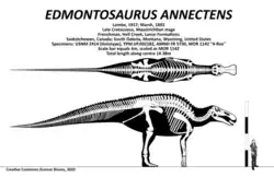 E. annectens is often seen as smaller. Two mounted skeletons, USNM 2414 and YPM 2182, measure 8.00 metres (26.25 ft) long and 8.92 metres (29.3 ft) long, respectively.[49][7] However, these are probably subadult individuals.[17] There is also at least one report of a much larger potential E. annectens specimen that is almost 12 metres (39 ft) long.[50] Two specimens still under study in the collection of the Museum of the Rockies - a 7.5 m (25 ft) tail labelled as MOR 1142 and another labelled as MOR 1609 - indicate that Edmontosaurus annectens could have grown to much larger sizes and reach nearly 15 metres (49 ft) in length,[51][52] and weighed up to 15.87 metric tons (17.49 short tons),[53] but such large individuals were likely very rare.[51]