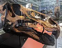 The skull of a fully grown Edmontosaurus could be over a metre long. One skull of E. annectens (formerly Anatotitan) measures 3.87 feet (1.18 m) long.[55] The skull was roughly triangular in profile,[18] with no bony cranial crest.[23] Viewed from above, the front and rear of the skull were expanded, with the broad front forming a duck-bill or spoon-bill shape. The beak was toothless, and both the upper and lower beaks were extended by keratinous material.[3] Substantial remains of the keratinous upper beak are known from the "mummy" kept at the Senckenberg Museum.[13] In this specimen, the preserved nonbony part of the beak extended for at least 8 centimetres (3.1 in) beyond the bone, projecting down vertically.[56] The nasal openings of Edmontosaurus were elongate and housed in deep depressions surrounded by distinct bony rims above, behind, and below.[34]