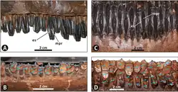 Teeth were present only in the maxillae (upper cheeks) and dentaries (main bone of the lower jaw). The teeth were continually replaced, taking about half a year to form.[59] They were composed of six types of tissues, rivaling the complexity of mammal teeth.[60] They grew in columns, with an observed maximum of six in each, and the number of columns varied based on the animal's size.[45] Known column counts for the two species are: 51 to 53 columns per maxilla and 48 to 49 per dentary (teeth of the upper jaw being slightly narrower than those in the lower jaw) for E. regalis; and 52 columns per maxilla and 44 per dentary for E. annectens (an E. saskatchewanensis specimen).[23]