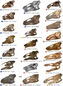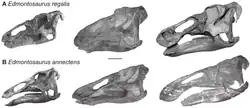 Edmontosaurus has been described in detail from numerous specimens.[18][19][22][45][46][47] Traditionally, E. regalis has been regarded as the largest species, though this was challenged by the hypothesis that the larger hadrosaurid Anatotitan copei is a synonym of Edmontosaurus annectens, as put forward by Jack Horner and colleagues in 2004,[3] and supported in studies by Campione and Evans in 2011.[17]