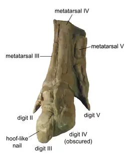 The fore legs were shorter and less heavily built than the hind legs. The upper arm had a large deltopectoral crest for muscle attachment, while the ulna and radius were slim. The upper arm and forearm were similar in length. The wrist was simple, with only two small bones. Each hand had four fingers, with no thumb (first finger). The index (second), third, and fourth fingers were approximately the same length and were united in life within a fleshy covering. Although the second and third finger had hoof-like unguals, these bones were also within the skin and not apparent from the outside. The little finger diverged from the other three and was much shorter. The thigh bone was robust and straight, with a prominent flange about halfway down the posterior side.[45] This ridge was for the attachment of powerful muscles attached to the hips and tail that pulled the thighs (and thus the hind legs) backward and helped maintain the use of the tail as a balancing organ.[63] Each foot had three toes, with no big toe or little toe. The toes had hoof-like tips.[45]