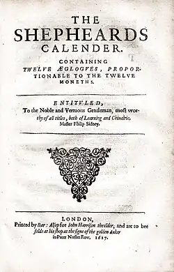 The Shepheardes Calender is Edmund Spenser's first major work, which appeared in 1579. It emulates Virgil's Eclogues of the first century BCE and the Eclogues of Mantuan by Baptista Mantuanus, a late medieval, early renaissance poet.[19] An eclogue is a short pastoral poem that is in the form of a dialogue or soliloquy. Although all the months together form an entire year, each month stands alone as a separate poem. Editions of the late 16th and early 17th centuries include woodcuts for each month/poem, and thereby have a slight similarity to an emblem book which combines a number of self-contained pictures and texts, usually a short vignette, saying, or allegory with an accompanying illustration.[20]