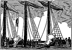 Twenty-five of the crew of the Ranger, including the ship's doctor, were tried between 10 July and 12 July, with Solgard giving evidence and recounting the battle.[22] The men were hanged for felony, piracy, and robbery near Newport, Rhode Island, on 19 July 1723.[1][12] Harris was sent back to England and hanged at Execution Dock in Wapping.[25] When Solgard returned to New York, he was presented with the freedom of the city and a gold snuffbox for his part in bringing some of Low's crew to justice.[10]