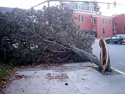 The winds downed trees throughout the area, some of which hit homes and vehicles. In Amelia County, strong winds removed a mobile home from its foundation and destroyed it.[18] Falling trees killed two in the area—one in Chesterfield County and one in the city of Richmond.[7] The downed trees snapped many power lines, leaving about 365,000 Dominion Virginia Power customers in the Richmond area without power.[13] A portion of the roof of The Diamond, home of the Richmond Braves, was damaged by the winds.[26]