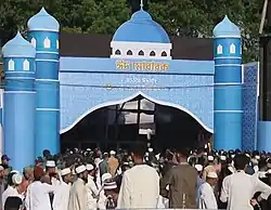 The Eid prayer is performed by the congregation in an open area such as a field, community center, or mosque.[16] No call to prayer is given for this Eid prayer, and it consists of only two rakaʿāt, with a variable amount of takbirs and other prayer elements depending on the branch of Islam observed. The Eid prayer is followed by the khutbah and then a dua asking for God's forgiveness, mercy, peace and blessings for all living beings across the world. The sermon also instructs Muslims as to the performance of rituals of Eid, such as the zakāt.[19] The sermon of Eid takes place after the Eid prayer, unlike Friday prayer which comes first before prayer. Some imams believe that listening to the sermon at Eid is optional.[20] After the prayers, Muslims visit their relatives, friends, and acquaintances or hold large communal celebrations in homes, community centers, or rented halls.[16]