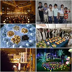 Clockwise from top: Bayram Namazı in Istanbul; Muslim children receiving Eidi; Afghan Eid celebrations; Decorations in the Maldives; Parade in Indonesia at night; Algerian Eid table