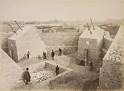 At first, the legs were constructed as cantilevers, but about halfway to the first level construction was paused to create a substantial timber scaffold. This renewed concerns about the structural integrity of the tower, and sensational headlines such as "Eiffel Suicide!" and "Gustave Eiffel Has Gone Mad: He Has Been Confined in an Asylum" appeared in the tabloid press.[27] Multiple famous artists of that time, Charles Garnier and Alexandre Dumas, thought poorly of the newly made tower. Charles Garnier thought it was a "truly tragic street lamp". Alexandre Dumas said that it was like "Odius shadow of the odious column built of rivets and iron plates extending like a black blot". There were multiple protests over the style and the reasoning of placing it in the middle of Paris.[28] At this stage, a small "creeper" crane designed to move up the tower was installed in each leg. They made use of the guides for the lifts which were to be fitted in the four legs. The critical stage of joining the legs at the first level was completed by the end of March 1888.[23] Although the metalwork had been prepared with the utmost attention to detail, provision had been made to carry out small adjustments to precisely align the legs; hydraulic jacks were fitted to the shoes at the base of each leg, capable of exerting a force of 800 tonnes, and the legs were intentionally constructed at a slightly steeper angle than necessary, being supported by sandboxes on the scaffold. Although construction involved 300 on-site employees,[23] due to Eiffel's safety precautions and the use of movable gangways, guardrails and screens, only one person died.[29]