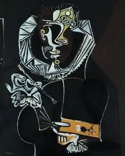 The early Cubist explorations of Picasso were to uncover other aspects in the work of El Greco: structural analysis of his compositions, multi-faced refraction of form, interweaving of form and space, and special effects of highlights. Several traits of Cubism, such as distortions and the materialistic rendering of time, have their analogies in El Greco's work. According to Picasso, El Greco's structure is Cubist.[125] On 22 February 1950, Picasso began his series of "paraphrases" of other painters' works with The Portrait of a Painter after El Greco.[126] Foundoulaki asserts that Picasso "completed ... the process for the activation of the painterly values of El Greco which had been started by Manet and carried on by Cézanne".[127]
