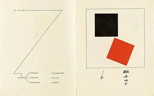 Little experimental book titled Pro 2 ■ (Pro 2 kvadrata: suprematicheskii skaz v 6i postroikakh (Of Two Squares: A Suprematist Tale in Six Constructions)) was created in 1920 in Vitebsk and published in 1922 in Berlin and then in De Stijl. It consists of 6 plates, and tells a story about two squares, red and black, travelling through space to Earth.[119] The book commands reader to participate, not just read it:[120]
