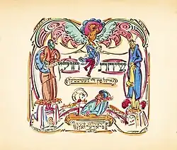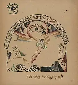In 1917 and 1919 Lissitzky created two variants of the book Had Gadya (The Only Kid), a ten-verse Aramaic song based on a German ballad, singed in a conclusion of a Passover seder. The song tells a story of a young goat purchased by a father, who was eaten by a cat; the song continues to talk about the succession of attackers until God destroys the final aggressor. The song is usually considered as an allegory for the oppression and execution of the Jews, with attackers being different peoples mistreating Jews throughout history.[21] Lissitzky used Yiddish for the book verses, but introduced each verse in a traditional Aramaic, written in Hebrew alphabet.[11] These two versions differ in style: art historians Igor Dukhan and Nancy Perloff called the 1917 version "an expressionist decorativism of color and narrative"[10] and "a set of brightly colored, folklike watercolors",[11] respectively, and 1919 version being "marked by a stylistic shift".[10]