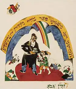Lissitzky invented a system of color coding in which the color of the principal character in each illustration matches the color of the corresponding word for that character in the Yiddish text. For instance, the kid in verse 1 is yellow, and the Yiddish word ציגעלע (kid) in the arch above is also yellow; the green hue of the father's face is matched by the green type used for the Yiddish word טאטע (father). While the bold colors and two-dimensionality of the lithographs are reminiscent of Chagall's work, the formal properties of the illustrations are also Cubistic in their use of geometric forms and Futuristic in their use of the spiral to evoke motion.[11]
