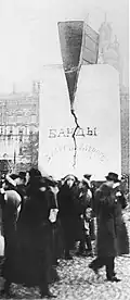 Perhaps the most famous work by Lissitzky from that period was the 1919 propaganda poster "Beat the Whites with the Red Wedge". Russia was going through a civil war at the time, which was mainly fought between the "Reds" (communists, socialists and revolutionaries) and the "Whites" (monarchists, conservatives, and factions of socialists who opposed the Bolshevik Revolution).[66] The title, allegedly recommended by Ilya Ehrenburg, is possibly a response to the pogrom slogan "Beat the Jews!" (Russian: Бей жидов!, romanized: Bej zhidov!).[67][68][69] The full slogan was Beat the Jews - save Russia! (Russian: Бей жидов — спасай Россию!), and it was predominantly used by right wing monarchists and the Black Hundreds.[70][71][72]