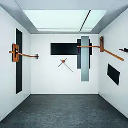 In 1923 Lissitzky created a Proun Room, an installation for the Grosse Berliner Kunstausstellung. It was a small room, about 3 by 3 by 2.5 m that he transformed into a single work of art, that encouraged viewers to "walk into an image".[106] One of the main ideas behind the Room was making its visitors not just passive spectators, but active participants.[107][108] By working in real, "actual space", he surpassed Malevich, who also designed three-dimensional "architectons" few years before; Malevich designs were never done in real form and existed only on paper.[108] By working in real space he "fullfiled UNOVIS's longtime dream of suprematist space".[106] Forgács writes that by designing and constructing the Proun Room Lissitzky proved himself as one of the progressive artists of 1920s Berlin;[108] however, he violated unwritten rule "to reject the commercialization of art and had put price tags on three three elements of the Proun Room". Price tags, together with Lissitzky's "half-dance" during the demonstration of the room to an audience, alienated his friend and colleague Theo van Doesburg.[109][110] Proun Room was recreated in 1965 in Stedelijk Van Abbemuseum by Jan Leering.[111][105]