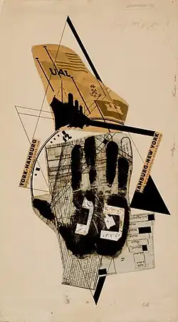 Jewish themes and symbols sometimes appeared in his later works: scholars found connections between his photomontage called The Constructor and Kabbalah,[39] his Figurinnenmappe (Traveler All Over the Time) was linked to Ahasver, "the everlasting Jew",[40] Hebrew letters were used in a number of Prouns and book covers he made, such as an illustration for Ilya Ehrenburg's story Shifs-Karta (Yiddish: שיפֿס קאַרטע; Passenger Ticket).[40][41] The illustration is a "photogram of the open hand with two Hebrew letters – 'pe' and 'nun' (traditional Jewish tombstone initials for "here lies"). In the foreground is the schedule of the New York–Hamburg and Hamburg–New York sea routes, a ship sailing to America, an American flag, and a framing Magen David".[42] The illustration was interpreted as "the end of Jewish wandering as well as the persistence of traditional Jewish beliefs."[41] Dukhan sees this work as an "intermediate play" between Lissitzky's "Jewish expressionism of the late 1910s" and the abstract language of the 1920s.[43] Nisbet interprets the black hand to be the hand of "pogrom-instigators", both "the Whites and the Communists, both of whom wish to eradicate the culture of the shtetl".[44]