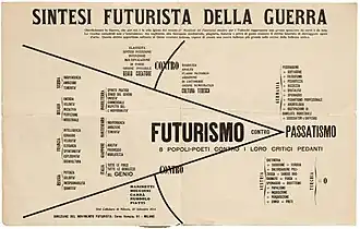 Art historian Maria Elena Versari connected Lissitzky's poster with Italian Futurism manifesto Futurist Synthesis of War, published in 20,000 copies in 1914, and signed by Filippo Tommaso Marinetti, Umberto Boccioni, Carlo Carrà, Luigi Russolo, and Ugo Piatti. Lissitzky never mentioned the manifesto, but his friend and colleague Malevich met Marinetti in 1914, and even called him one of the "two pillars, the two 'prisms' of the new art of the twentieth century".[i] Also in 1918, young architect Nikolai Kolli created The Red Wedge monument in Moscow, that "consisted of a red triangle vertically inserted as a wedge into a white rectangular block. A very visible crack snakes downward from the tip of the triangle, suggesting that the force of the red wedge has succeeded in breaking the solidity of the white structure. The abstract metaphor was intended to signify the victory of the Red Army over the White, counter-Revolutionary forces." The monument was initially erected as a symbol of victory over White general Pyotr Krasnov, an important early triumph of the Red Army. Versari argues that Lissitzky "adopted an almost identical language" for his Beat the Whites with the Red Wedge, though he never mentioned it.[74]