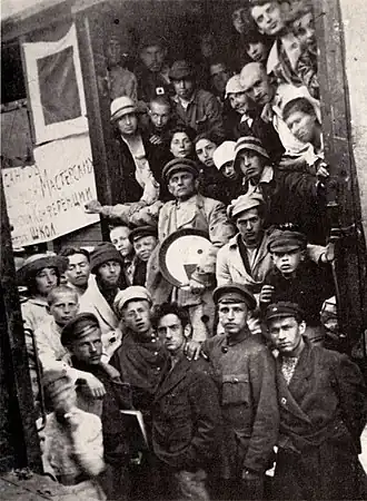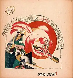While in Darmstadt, Lissitzky travelled to Worms to study its medieval synagogue, when he returned to Russia he became involved in a Jewish artistic circle.[10] In 1917, he became secretary of the organizing committee of the Moscow Exhibition of Paintings and Sculpture by Jewish Artists.[8] After the Revolution the Tsarist 1915 decree that prohibited usage of Hebrew lettering in print was abolished,[12] and Jews acquired the rights as any other people of the former Russian Empire. Lissitzky moved to Kiev in 1917, and started to work with Yiddish book design.[11] One of the goals of Lissitzky and his Jewish colleagues was an attempt to create new, secular Jewish culture;[13] one of his main ideas and desires of that time was creation of "an all-inclusive art and culture in Russia".[14]