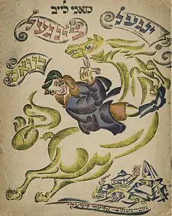Lissitzky's first book design was Moishe Broderzon's 1917 Sikhes khulin: Eyne fun di geshikhten (An Everyday Conversation: A Story, also called The Legend of Prague), created in a form of a Torah scroll.[17] The book was printed in 110 copies. Lissitzky explained in the colophon that he "intended to couple the style of the story with the 'wonderful' style of the square Hebrew letters." In 1918 he illustrated Mani Leib's book Yingl Tsingl Khvat (The Mischievous Boy), incorporating typography into the illustrations.[11][f] Lissitzky created ten illustrations for the book; for each page he arranged text and his drawings differently.[18]