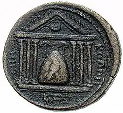 A lavish temple called the Elagabalium was built on the east face of the Palatine Hill to house Elagabal,[76] who was represented by a black conical meteorite from Emesa.[48] This was a baetyl. Herodian wrote "this stone is worshipped as though it were sent from heaven; on it there are some small projecting pieces and markings that are pointed out, which the people would like to believe are a rough picture of the sun, because this is how they see them".[77]