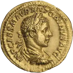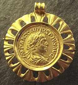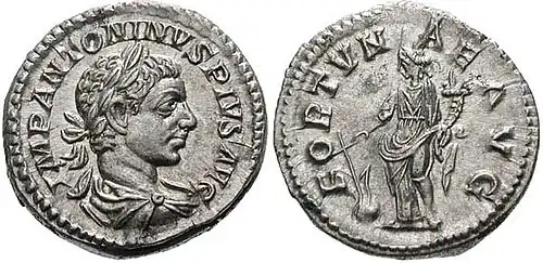 Under Elagabalus, the gradual devaluation of Roman aurei and denarii continued (with the silver purity of the denarius dropping from 58% to 46.5%),[68] though antoniniani had a higher metal content than under Caracalla.[69]