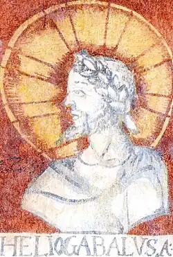 Marcus Aurelius Antoninus (born Sextus Varius Avitus Bassianus, c. 204 – 13 March 222), better known by his posthumous nicknames Elagabalus (/ˌɛləˈɡæbələs/ EL-ə-GAB-ə-ləs) and Heliogabalus (/ˌhiːliə-, -lioʊ-/ HEE-lee-ə-, -lee-oh-[3]), was Roman emperor from 218 to 222, while he was still a teenager. His short reign was notorious for religious controversy and alleged sexual debauchery. A close relative to the Severan dynasty, he came from a prominent Syrian Arab family in Emesa (Homs), Syria, where he served as the head priest of the sun god Elagabal from a young age. After the death of his cousin, the emperor Caracalla, Elagabalus was raised to the Principate at 14 years of age in an army revolt instigated by his grandmother Julia Maesa against Caracalla's short-lived successor, Macrinus. He only posthumously became known by the Latinised name of his god.[a]