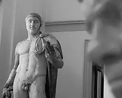 Following his assassination, many associates of Elagabalus were killed or deposed. His lover Hierocles was executed.[98] His religious edicts were reversed and the stone of Elagabal was sent back to Emesa.[102] Women were again barred from attending meetings of the Senate.[103] The practice of damnatio memoriae—erasing from the public record a disgraced personage formerly of note—was systematically applied in his case.[49][104] Several images, including an over-life-size statue of him as Hercules now in Naples, were re-carved with the face of Alexander Severus.[105]