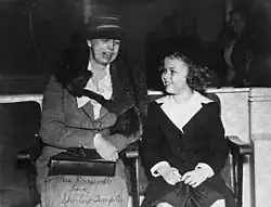Roosevelt also had a close relationship with Associated Press (AP) reporter Lorena Hickok (1893–1968), who covered her during the last months of the presidential campaign and "fell madly in love with her."[60] During this period, Roosevelt wrote daily 10- to 15-page letters to "Hick," who was planning to write a biography of the First Lady.[61] The letters included such endearments as, "I want to put my arms around you & kiss you at the corner of your mouth,"[62] and, "I can't kiss you, so I kiss your 'picture' good night and good morning!"[63] At Franklin's 1933 inauguration, Roosevelt wore a sapphire ring Hickok had given her.[64] FBI Director J. Edgar Hoover despised Roosevelt's liberalism, her stance regarding civil rights, and criticisms of Hoover's surveillance tactics by both her and her husband, and so Hoover maintained a large file on Roosevelt,[65][66] which the filmmakers of the biopic J. Edgar (2011) indicate included compromising evidence of this relationship, with which Hoover intended to blackmail Roosevelt. Compromised as a reporter, Hickok soon resigned her position with the AP to be closer to Roosevelt, who secured her a job as an investigator for a New Deal program.[67]