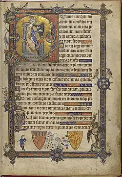 After Eleanor succeeded her mother as Countess of Ponthieu in 1279, a romance about the life of a fictional, ninth-century count of Ponthieu was written for her. Eleanor commissioned an Arthurian romance with a Northumbrian theme, possibly for the marriage of the Northumbrian lord John de Vescy, who married a close friend and relation of hers. In the 1280s, Archbishop Peckham wrote a theological work for Eleanor to explain angels and their roles.[68] She almost certainly commissioned the Alphonso Psalter, which is now in the British Library, and is also thought to be the commissioner of the Bird Psalter, which bears the arms of Alphonso and his prospective wife.[67] Eleanor's accounts reveal her corresponding in 1290 with an Oxford master about one of her books.[68] There is also evidence Eleanor exchanged books with her brother Alfonso X.[69] Eleanor is assumed to have spoken French, which was her mother's language and the dominant language of the English court.[70] All of the extant literary works created for Eleanor are in French.[71]