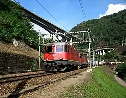 The first practical AC electric locomotive was designed by Charles Brown, then working for Oerlikon, Zürich. In 1891, Brown had demonstrated long-distance power transmission for the International Electrotechnical Exhibition, using three-phase AC, between a hydro–electric plant at Lauffen am Neckar and the expo site at Frankfurt am Main West, a distance of 280 km. Using experience he had gained while working for Jean Heilmann on steam–electric locomotive designs, Brown observed that three-phase motors had a higher power-to-weight ratio than DC motors and, because of the absence of a commutator, were simpler to manufacture and maintain.[i] However, they were much larger than the DC motors of the time and could not be mounted in underfloor bogies: they could only be carried within locomotive bodies.[14] In 1896, Oerlikon installed the first commercial example of the system on the Lugano Tramway. Each 30-tonne locomotive had two 110 kW (150 hp) motors run by three-phase 750 V 40 Hz fed from double overhead lines. Three-phase motors run at a constant speed and provide regenerative braking and are thus well suited to steeply graded routes; in 1899 Brown (by then in partnership with Walter Boveri) supplied the first main-line three-phase locomotives to the 40 km Burgdorf–Thun railway (highest point 770 metres), Switzerland. The first implementation of industrial frequency single-phase AC supply for locomotives came from Oerlikon in 1901, using the designs of Hans Behn-Eschenburg and Emil Huber-Stockar; installation on the Seebach-Wettingen line of the Swiss Federal Railways was completed in 1904. The 15 kV, 50 Hz 345 kW (460 hp), 48 tonne locomotives used transformers and rotary converters to power DC traction motors.[15]