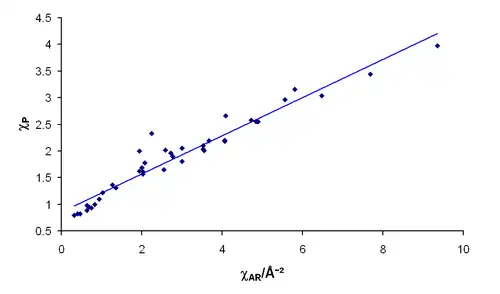 As it is usually calculated, electronegativity is not a property of an atom alone, but rather a property of an atom in a molecule.[5] Even so, the electronegativity of an atom is strongly correlated with the first ionization energy. The electronegativity is slightly negatively correlated (for smaller electronegativity values) and rather strongly positively correlated (for most and larger electronegativity values) with the electron affinity.[6] It is to be expected that the electronegativity of an element will vary with its chemical environment,[7] but it is usually considered to be a transferable property, that is to say, that similar values will be valid in a variety of situations.