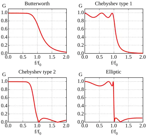 Here is an image comparing Butterworth, Chebyshev, and elliptic filters. The filters in this illustration are all fifth-order low-pass filters. The particular implementation – analog or digital, passive or active – makes no difference; their output would be the same.