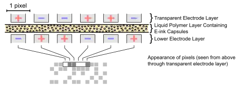 This used tiny microcapsules filled with electrically charged white particles suspended in a colored oil.[19] In early versions, the underlying circuitry controlled whether the white particles were at the top of the capsule (so it looked white to the viewer) or at the bottom of the capsule (so the viewer saw the color of the oil). This was essentially a reintroduction of the well-known electrophoretic display technology, but microcapsules meant the display could be made on flexible plastic sheets instead of glass. One early version of the electronic paper consists of a sheet of very small transparent capsules, each about 40 micrometers across. Each capsule contains an oily solution containing black dye (the electronic ink), with numerous white titanium dioxide particles suspended within. The particles are slightly negatively charged, and each one is naturally white.[7] The screen holds microcapsules in a layer of liquid polymer, sandwiched between two arrays of electrodes, the upper of which is transparent. The two arrays are aligned to divide the sheet into pixels, and each pixel corresponds to a pair of electrodes situated on either side of the sheet. The sheet is laminated with transparent plastic for protection, resulting in an overall thickness of 80 micrometers, or twice that of ordinary paper. The network of electrodes connects to display circuitry, which turns the electronic ink 'on' and 'off' at specific pixels by applying a voltage to specific electrode pairs. A negative charge to the surface electrode repels the particles to the bottom of local capsules, forcing the black dye to the surface and turning the pixel black. Reversing the voltage has the opposite effect. It forces the particles to the surface, turning the pixel white. A more recent implementation of this concept requires only one layer of electrodes beneath the microcapsules.[21][22] These are commercially referred to as Active Matrix Electrophoretic Displays (AMEPD).