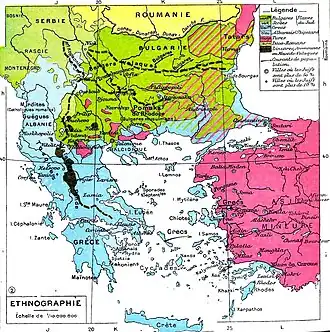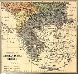 In reaction to the rebellion of Crete and the assistance sent by Greece, the Ottomans had relocated a significant part of their army in the Balkans to the north of Thessaly, close to the borders with Greece.[39] Greece in reply reinforced its borders in Thessaly. However, irregular Greek forces, who were members of the Ethniki Etairia (followers of the Megali Idea) acted without orders and raided Turkish outposts,[40] leading the Ottoman Empire to declare war on Greece on 17 April. The war was a disaster for Greece. The Turkish army was better prepared, in large part due to the recent reforms carried out by a German mission under Baron von der Goltz, and the Greek army was in retreat within weeks. The Great Powers again intervened, and an armistice was signed in May 1897.[41]