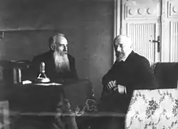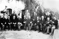 Historians disagree on the exact ancestry of Venizelos.[6] Chester and Kerofilas, contemporary historians and Venizelos' biographers, stated that the 18th century ancestors of Venizelos, under the surname of Cravvatas, lived in Mystras, in southern Peloponnese.[7][8] In the Ottoman raids in the peninsula in 1770, a member of the Cravvatas family (Venizelos Cravvatas), the youngest of several brothers, managed to escape and established himself in Crete.[7] His sons abandoned the patronymic name and called themselves Venizelos instead. However, during the National Schism, politician Konstantinos Krevattas denied that his family had any relation to Venizelos. In a letter to a Cretan partner, Venizelos wrote that his father Kyriakos had taken part in the siege of Monemvasia in 1821 with his brother Hatzinikolos Venizelos and three more brothers, suggesting that his grandfather probably was Hatzipetros Venizelos, a merchant from Kythira.[9] Michael Llewellyn-Smith stated in a 2022 biography that Venizelos' father was "born in Crete, in or around 1810, to a family from the Peloponnese."[10] Venizelos' mother, Styliani Ploumidakis, descended from the village of Theriso in Crete, from a well-respected family partly because it was (distant) related to a prominent 1821 revolution general Vasilios Chalis.[11]