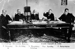 In January 1897, violence and disorder escalated on the island, thus polarizing the population. Massacres against the Christian population took place in Chania[21][22][23] and Rethimno.[23][24][25] The Greek government, pressured by public opinion, intransigent political elements, extreme nationalist groups such as Ethniki Etaireia,[26] and the reluctance of the Great Powers to intervene, decided to send warships and army personnel to defend the Cretan Greeks.[27] The Great Powers had no option then but to proceed with the occupation of the island, but they were late. A Greek force of about 2,000 men had landed at Kolymbari on 3 February 1897,[28] and its commanding officer, Colonel Timoleon Vassos declared that he was taking over the island "in the name of the King of the Hellenes" and that he was announcing the union of Crete with Greece.[29]This led to an uprising that spread immediately throughout the island. The Great Powers decided to blockade Crete with their fleets and land their troops, thus stopping the Greek army from approaching Chania.[30]