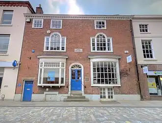 Ashmole was born on 23 May 1617[2][3] in Breadmarket Street, Lichfield, Staffordshire.[4] His family had been prominent, but their fortunes had declined by the time of Ashmole's birth. His mother, Anne, was the daughter of a wealthy Coventry draper, Anthony Bowyer, and a relative of James Paget, a Baron of the Exchequer. His father, Simon Ashmole, was a saddler who had served as a soldier in Ireland and Europe. Elias attended Lichfield Grammar School (now King Edward VI School) and became a chorister at Lichfield Cathedral. In 1633, he went to live in London as mentor to Paget's sons, and in 1638, with James Paget's help, he qualified as a solicitor. He enjoyed a successful legal practice in London, and married Eleanor Mainwaring, a member of a déclassé Cheshire aristocratic family, who died while pregnant[5] only three years later on 6 December 1641.[2] Still in his early twenties, Ashmole had taken the first steps towards status and wealth. He also became allied with Major-General Charles Worsley, brother-in-law of his sister, Mary Ashmole, who married John Booth of Salford.