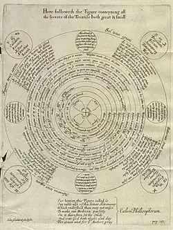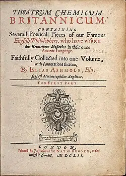 During the 1650s, Ashmole devoted a great deal of energy to the study of alchemy. In 1650, he published Fasciculus Chemicus under the anagrammatic pseudonym James Hasolle. This work was an English translation of two Latin alchemical works, one by Arthur Dee, the son of John Dee. In 1652, he published his most important alchemical work, Theatrum Chemicum Britannicum, an extensively annotated compilation of metaphysical poems in English. The book preserved and made available many works that had previously existed only in privately held manuscripts. A corrected edition using Ashmole's two errata sheets and the additional chapter seven of a piece by Thomas Charnock was published in 2011.[17] There is little evidence that Ashmole conducted his own alchemical experiments. He appears to have been a collector of alchemical writings and a student of alchemy rather than an active practitioner. He referred to himself as the son of William Backhouse, who adopted him in 1651 as his spiritual son—for the connection he gave him to the long spiritual chain of hermetic wisdom that Backhouse was part of. According to Ashmole, Backhouse "intytle[d] me to some small parte Of grand sire Hermes wealth [sic]".[18] His final alchemical publication was The Way to Bliss in 1658, but thereafter his interest seems to wane in favour of his other pursuits.[2] Ashmole promoted the use of therapeutic remedies drawing on both Galenic and Paracelsian principles, and his works attempt to merge the two schools. The Way to Bliss recommends ways to prevent illness: a balanced diet, moderate exercise and enough sleep.[19] His works were avidly studied by other natural philosophers, such as Isaac Newton.[20]