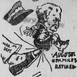 His chief obstacle was Commanding General of the Army Nelson A. Miles; the offices of Commanding General and Secretary of War had long been engaged in a power struggle, and Root's reforms would directly implicate Miles's authority.[30] Root proposed the establishment of a General Staff led by the office of Chief of Staff of the United States Army. The Chief of Staff was to be a general officer of the Army answerable directly to the Secretary of War and the President. The Chief of Staff would carry out the Secretary's instructions and supervise discipline and maneuvers.[28] The reorganization was accomplished by an act of Congress passed on February 14, 1903. Root also changed the procedures for promotions and also devised the principle of rotating officers from staff to line. Working with Secretary of the Navy William Henry Moody, Root established closer coordination between the Army and Navy, including the establishment of a joint board under General Orders No. 107.[28]