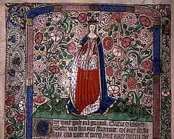 One of only three lyric poems in Middle English ascribed to a woman author,[38] alongside "An Anchoress' Hymn to the Virgin" and "Eleanor Percy's Prayer", "My heart is set upon a lusty pin"[39] is attributed to one "Queen Elizabeth", sometimes thought to have been Elizabeth Woodville (although the author is also argued[39][40] to have been her daughter, Elizabeth of York). This hymn to Venus, found in one single manuscript,[41] is a complex six-stanza poem[42] with rhyme scheme ABABBAA, an "elaboration of the sestina",[43] in which the seventh line of each stanza is the same as its first, and the six unique lines of the first stanza provide the first lines for each of the poem's six stanzas.
