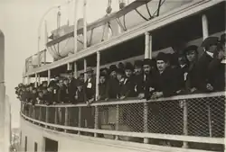 Additional improvements and routine maintenance work were completed in the early 1910s.[142][144] A greenhouse was built in 1910,[142][147] and the contagious-diseases ward on island 3 opened the following June.[148][144] In addition, the incinerator was replaced in 1911,[143][135] and a recreation center operated by the American Red Cross was also built on island 2 by 1915.[143][147] These facilities generally followed the design set by Tilton and Boring.[135] When the Black Tom explosion occurred on Black Tom Island in 1916, the complex suffered moderate damage; though all immigrants were evacuated safely, the main building's roof collapsed, and windows were broken. The main building's roof was replaced with a Guastavino-tiled arched ceiling by 1918.[149][150][151] The immigration station was temporarily closed during World War I in 1917–1919, during which the facilities were used as a jail for suspected enemy combatants, and later as a treatment center for wounded American soldiers. Immigration inspections were conducted aboard ships or at docks.[20][143][152][151] During the war, immigration processing at Ellis Island declined by 97%, from 878,000 immigrants per year in 1914 to 26,000 per year in 1919.[153]