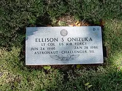 Onizuka is buried at the National Memorial Cemetery of the Pacific in Honolulu.[8] At the time of his death, he held the rank of lieutenant colonel. Onizuka was posthumously promoted to the rank of colonel.[14]