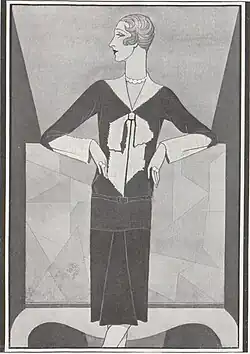 Whilst in Paris, Schiaparelli—"Schiap" to her friends—began making her own clothes. With encouragement from Poiret, she started her own business, but it closed in 1926 despite favourable reviews.[10] She launched a new collection of knitwear in early 1927 using a special double layered stitch created by Armenian refugees and featuring sweaters with surrealist trompe-l'œil images.[10] Although her first designs appeared in Vogue, the business really took off with a pattern that gave the impression of a scarf wrapped around the wearer's neck.[10] The "pour le Sport" collection expanded the following year to include bathing suits, ski-wear, and linen dresses. Schiaparelli added evening wear to her collections in 1931, using the luxury silks of Robert Perrier, and the business went from strength to strength, in 1935, culminating in a move from Rue de la Paix to acquiring the renowned salon of Louise Chéruit at 21 Place Vendôme, which was rechristened the Schiap Shop.[10][37] Schiaparelli's 98-room salon and work studios occupied the distinguished Hôtel de Fontpertuis, built in the 17th century by Pierre Bullet.[10]