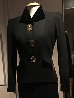 A darker tone was set when France declared war on Germany in 1939. Schiaparelli's Spring 1940 collection featured "trench" brown and camouflage print taffetas.[10] Soon after the fall of Paris on 14 June 1940, Schiaparelli sailed to New York for a lecture tour; apart from a few months in Paris in early 1941, she remained in New York City until the end of the war.[10] On her return she found that fashions had changed, with Christian Dior's "New Look" marking a rejection of pre-war fashion. The house of Schiaparelli struggled in the austerity of the post-war period. Schiaparelli discontinued her couture business in 1951, and finally closed down the heavily indebted design house in December 1954,[41][10] the same year that her great rival Coco Chanel returned to the business.