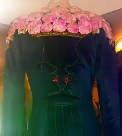 In 1937 Schiaparelli collaborated with the artist Jean Cocteau to produce two of her most notable art-themed designs for that year's Autumn collection.[63] An evening jacket was embroidered with a female figure with one hand caressing the waist of the wearer, and long blonde hair cascading down one sleeve.[64] A long evening coat featured two profiles facing each other, creating the optical illusion of a vase of roses.[63] The embroidering of both garments was executed by the couture embroiderers Lesage.[63][64]