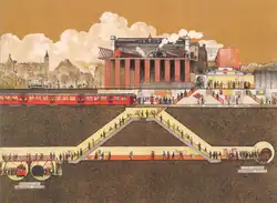 In 1897 the DR obtained parliamentary permission to construct a deep-level tube railway running between Gloucester Road and Mansion House beneath the sub-surface line. The new line was to be an express route using electric trains to relieve congestion on the sub-surface tracks. Only one intermediate station was planned, at Charing Cross, 63 feet (19 m) below the sub-surface platforms.[12] No immediate work was carried out on the deep-level line, and the subsequent take over of the DR by the Underground Electric Railways Company of London (UERL) and the resignalling and electrification of the DR's routes between 1903 and 1905 meant that congestion was relieved without needing to construct the deep-level line. The plan was dropped in 1908.[13]