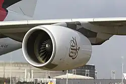 Emirates logo (in Arabic) painted on one of its Airbus A380-800's engines