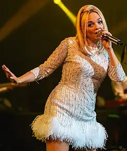 Their performance was the most tweeted moment of Olympics closing ceremony with over 116,000 tweets on Twitter per minute.[44] Bunton also worked with fellow Spice Girl Melanie C on her 2012 album, Stages for the album track "I Know Him So Well". The song was released as a single on 11 November 2012.[45] In March 2013, Bunton was named the Foxy Bingo Celebrity Mum of the Year.[46] In March 2014, Bunton, along with Melanie C, took part in recording England's 2014 World Cup song. She collaborated with fellow pop stars Eliza Doolittle, Katy B, Conor Maynard, Kimberley Walsh and Pixie Lott on "Greatest Day", a track originally performed by British band Take That. The track was produced by Gary Barlow and recorded at Sarm Studios in London. The track also featured past footballers such as Gary Lineker, Michael Owen, Geoff Hurst, David Seaman, Peter Shilton, Glenn Hoddle and Dion Dublin on backing vocals.[47]
