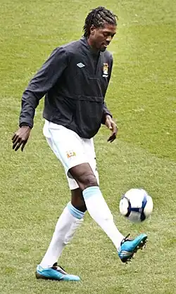 ![]() Adebayor warming-up with Manchester City in 2010 | |||